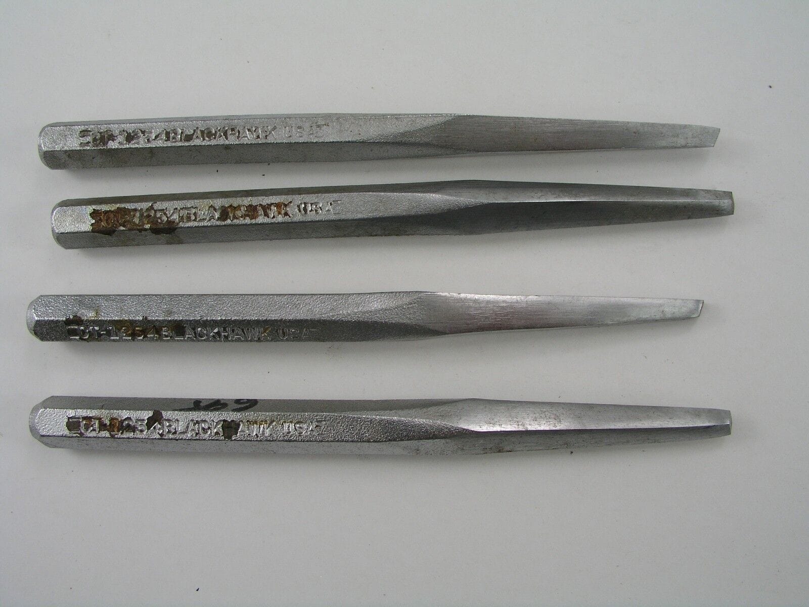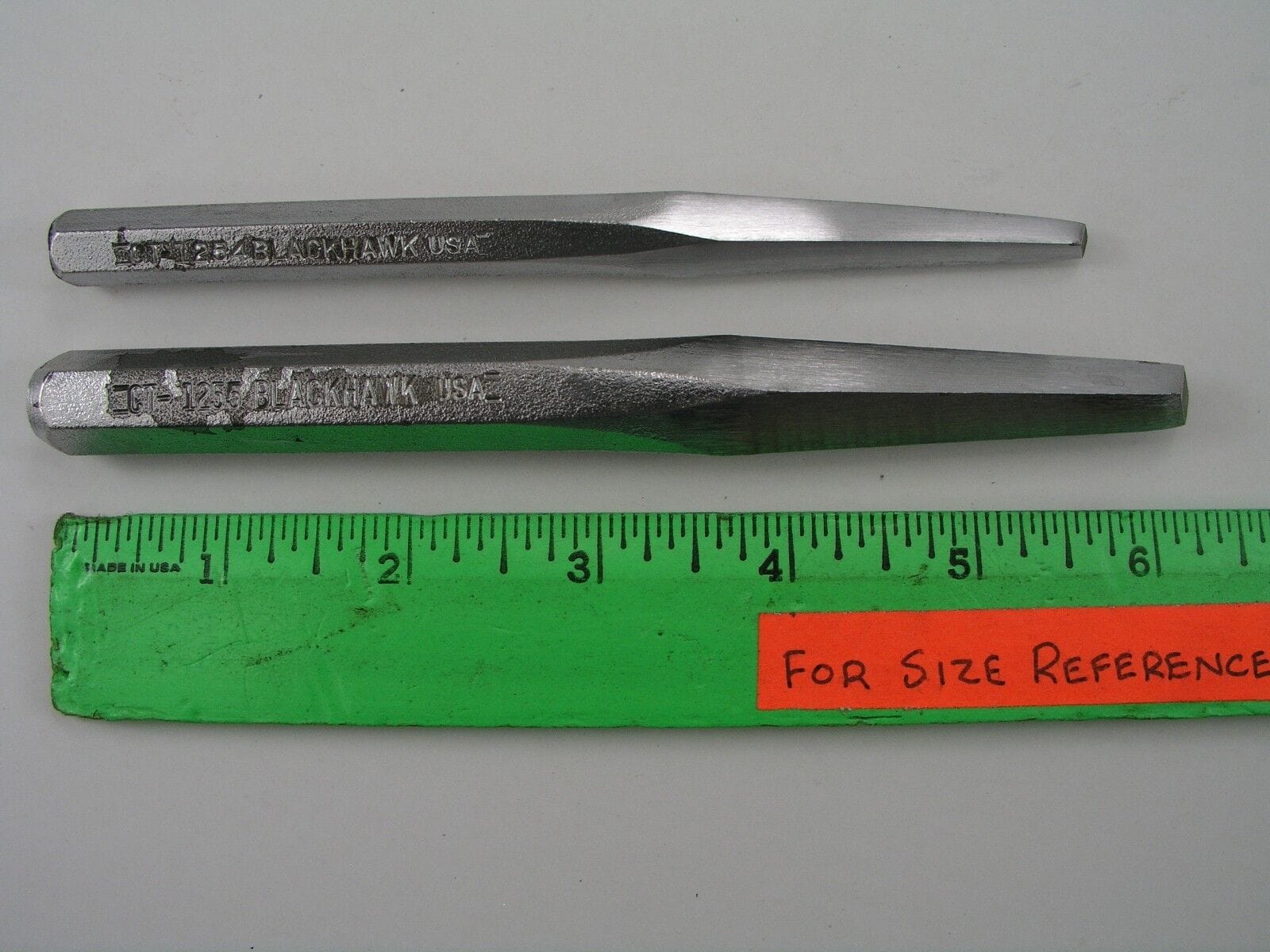 Listing is for 1 each Blackhawk CT-1254 & CT-1255 diamond point chisel. These are heavy duty, alloy steel chisels. These are new but they have varying amounts of peeling chrome. The main listing photo with the ruler shows two that have been cleaned up with a wire wheel. The remaining photos shows the typical condition of them before cleaning. YOU WILL BE SHIPPED 2 UN-CLEANED CHISELS.