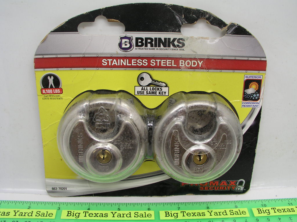 Brinks 2-3/4″ round locks with hardened cut resistant hasp, 4 pin pick resistant tumblers.