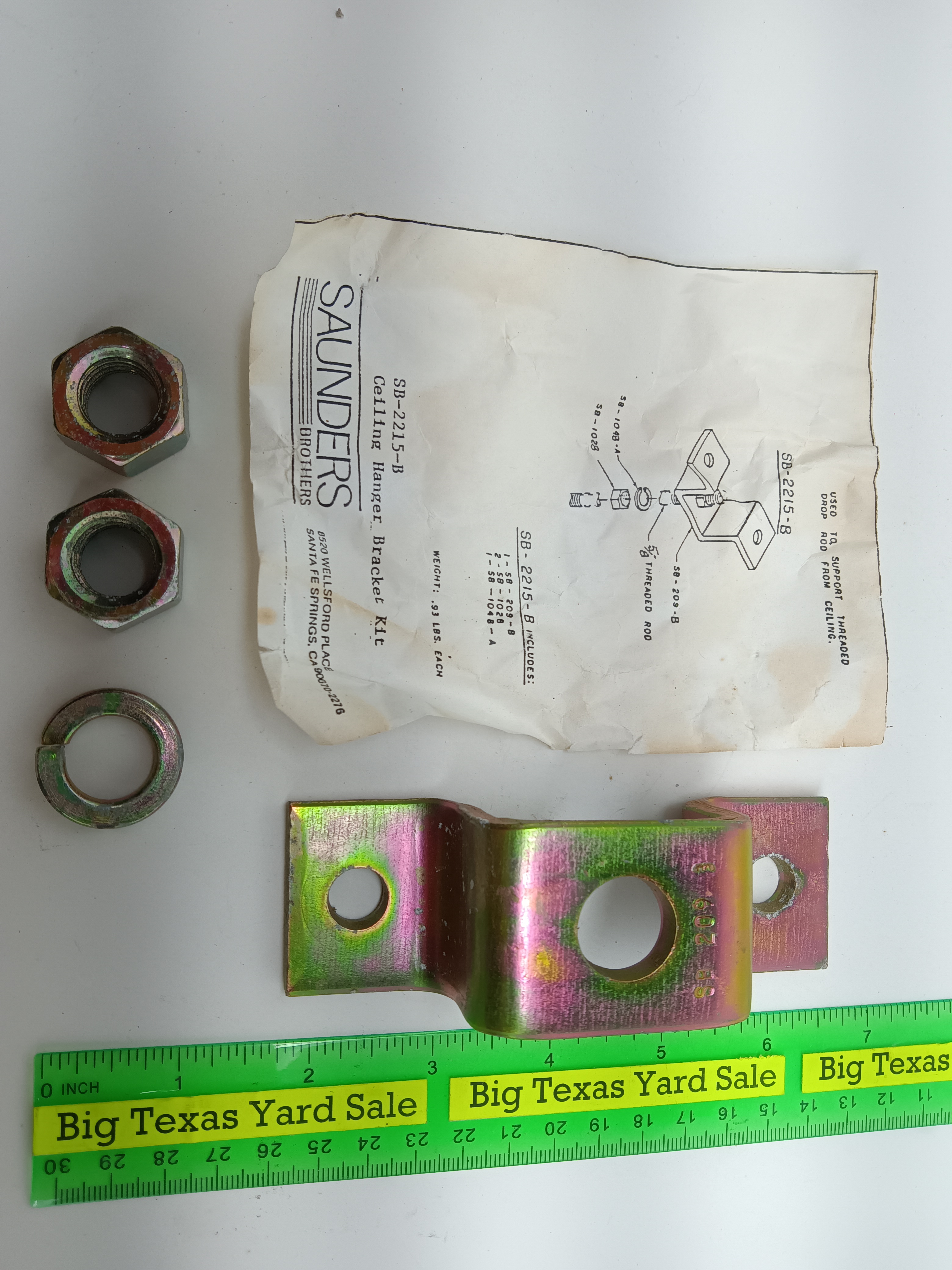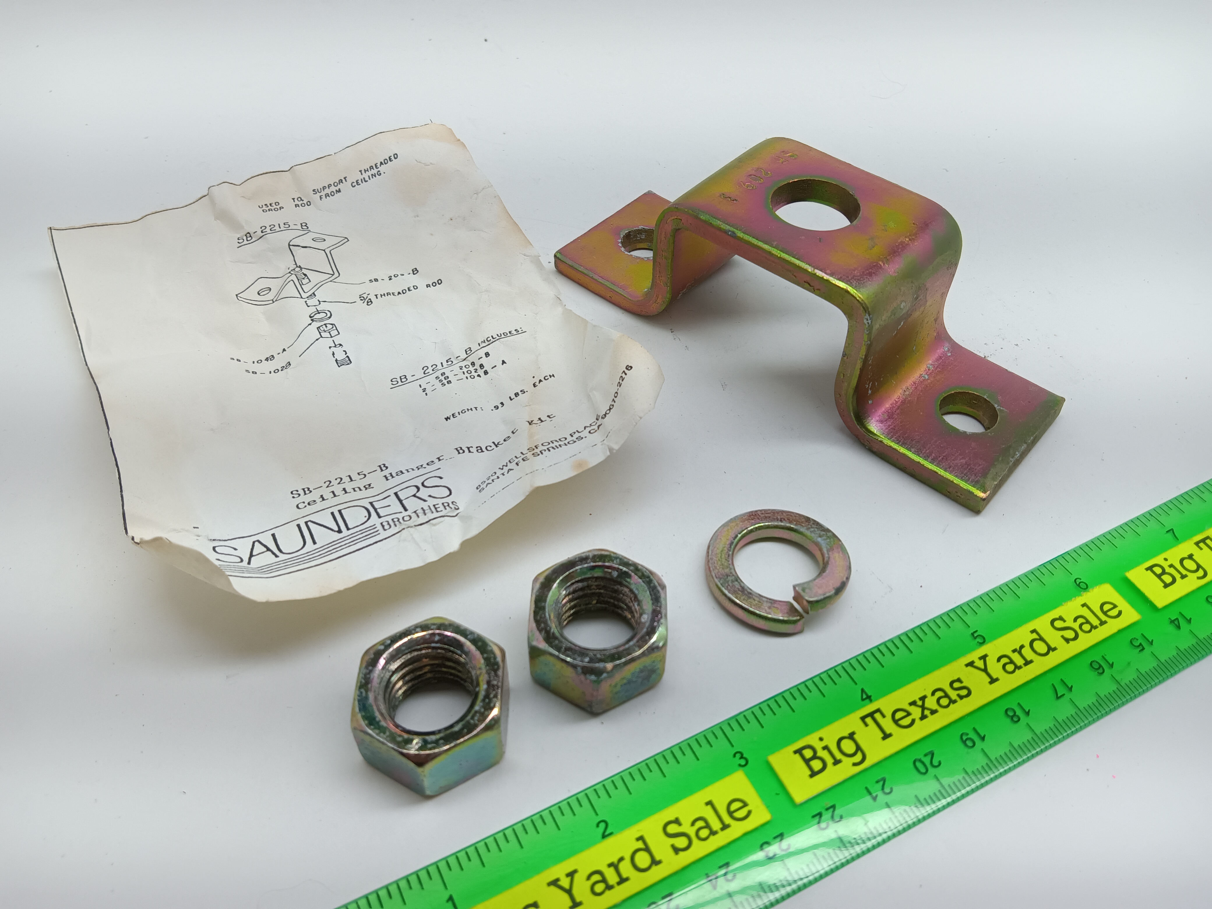 SB-2215-B ceiling hanger brackets for use with 5/8″ all-thread rod. Each kit includes bracket, and 2) 5/8″ nuts and a lock washer. Mounting holes are 7/16″ and on 3-1/2″ centers. Bracket is 1-1/2″ wide, 1-1/2″ high and 7/32″ thick.