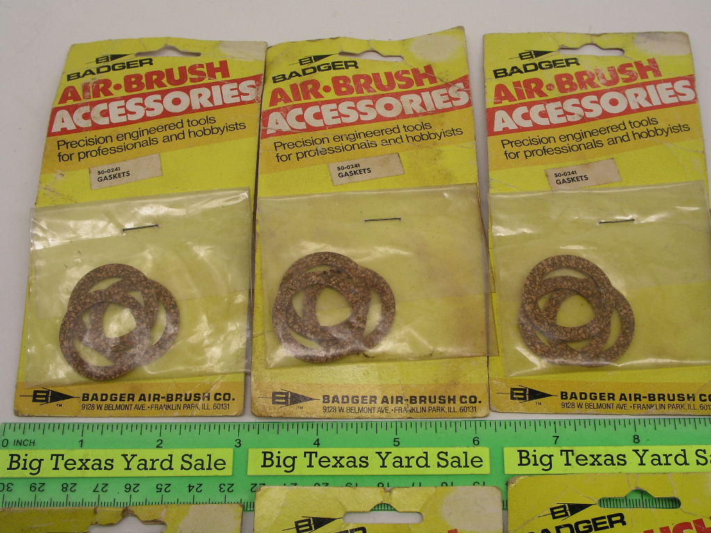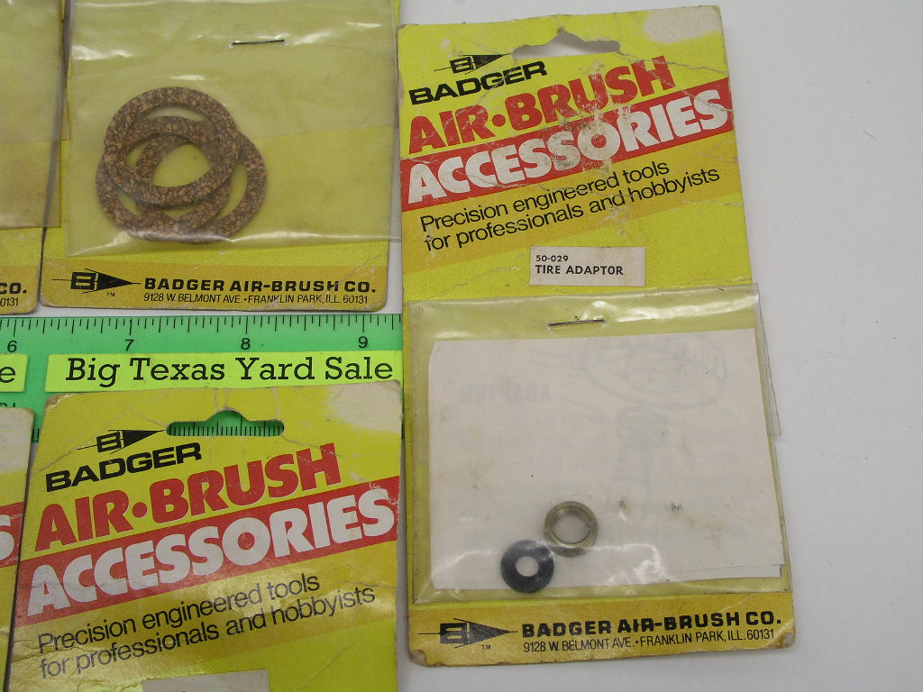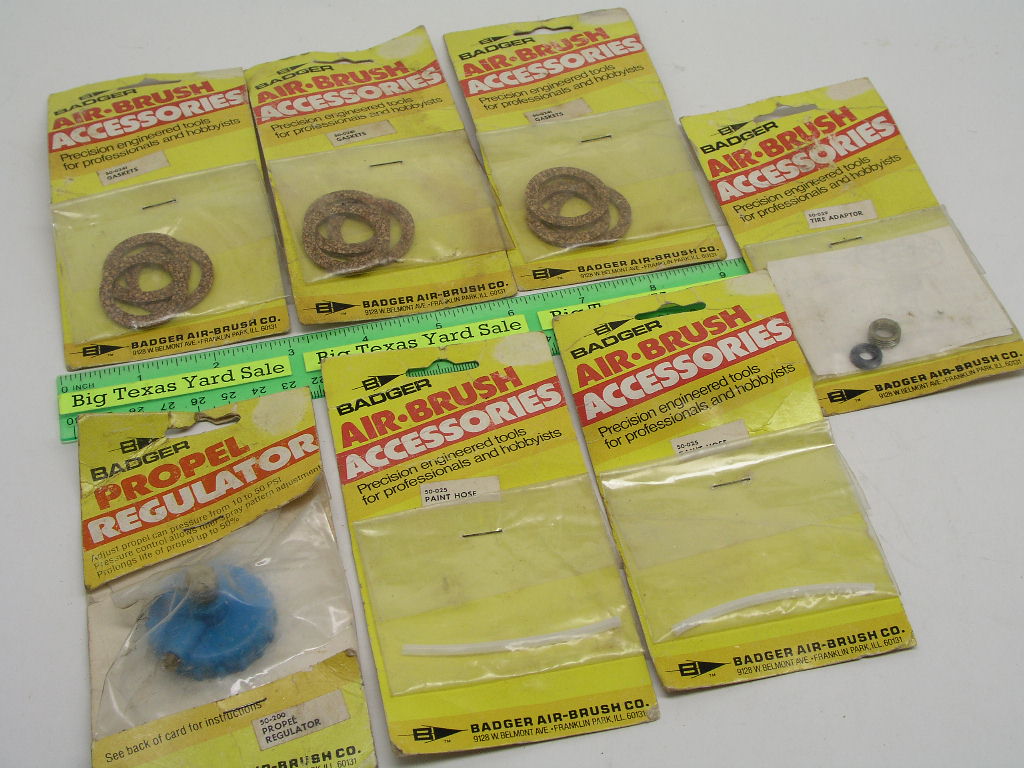7 pc Lot of Badger Air Brush Parts & Accessories includes 3x 3pc paint jar gaskets, 1x propelent regulator, 1x tire adapter for operating off an inflated tire, and 2x paint jar pick up tubes.    New, but packaging in poor condition and not cosmetically perfect.