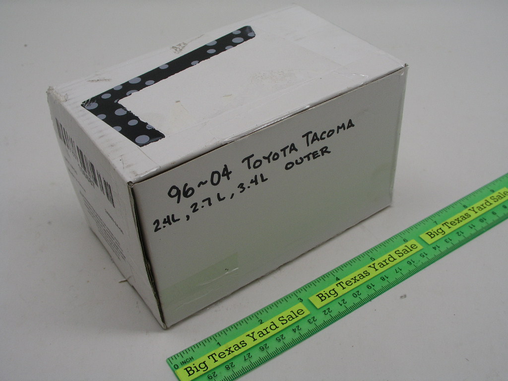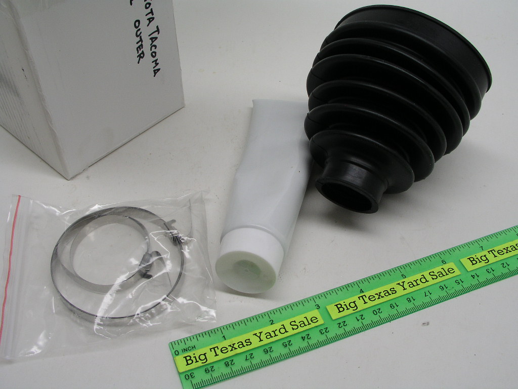 96-04 Toyota Tacoma Outer V\CV Axle Boot Kit includes the boot, band clamp, and grease. Fits 2.4L, 2.7L, and 3.4L Tacomas. New, packaging in poor condition.
