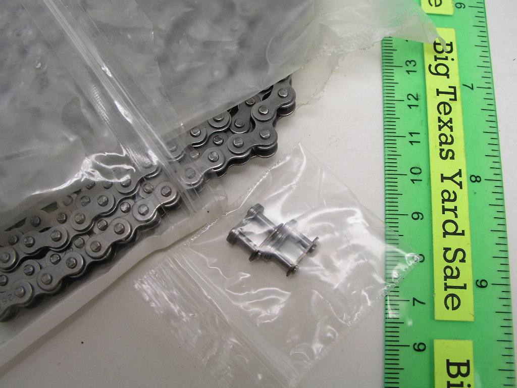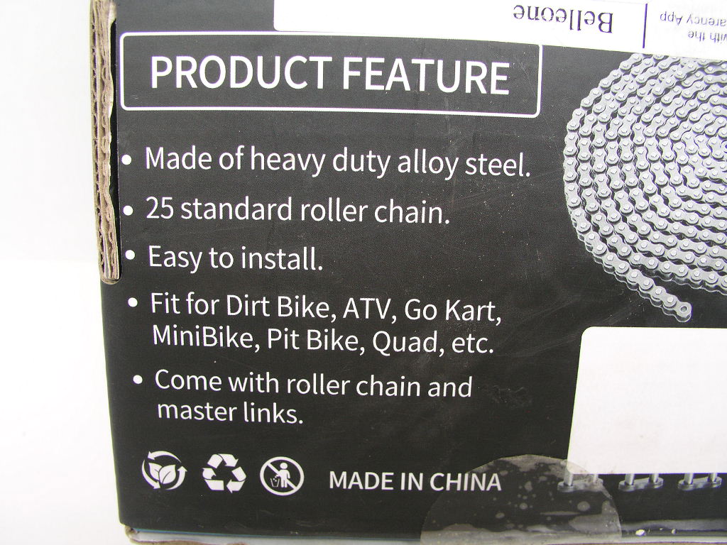 Belleone #25 Roller Chain includes 2 master links and is 480 links long. Typically fits Razors and various e scooters that use a #25 chain. New, but packaging in poor condition.