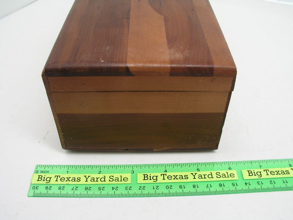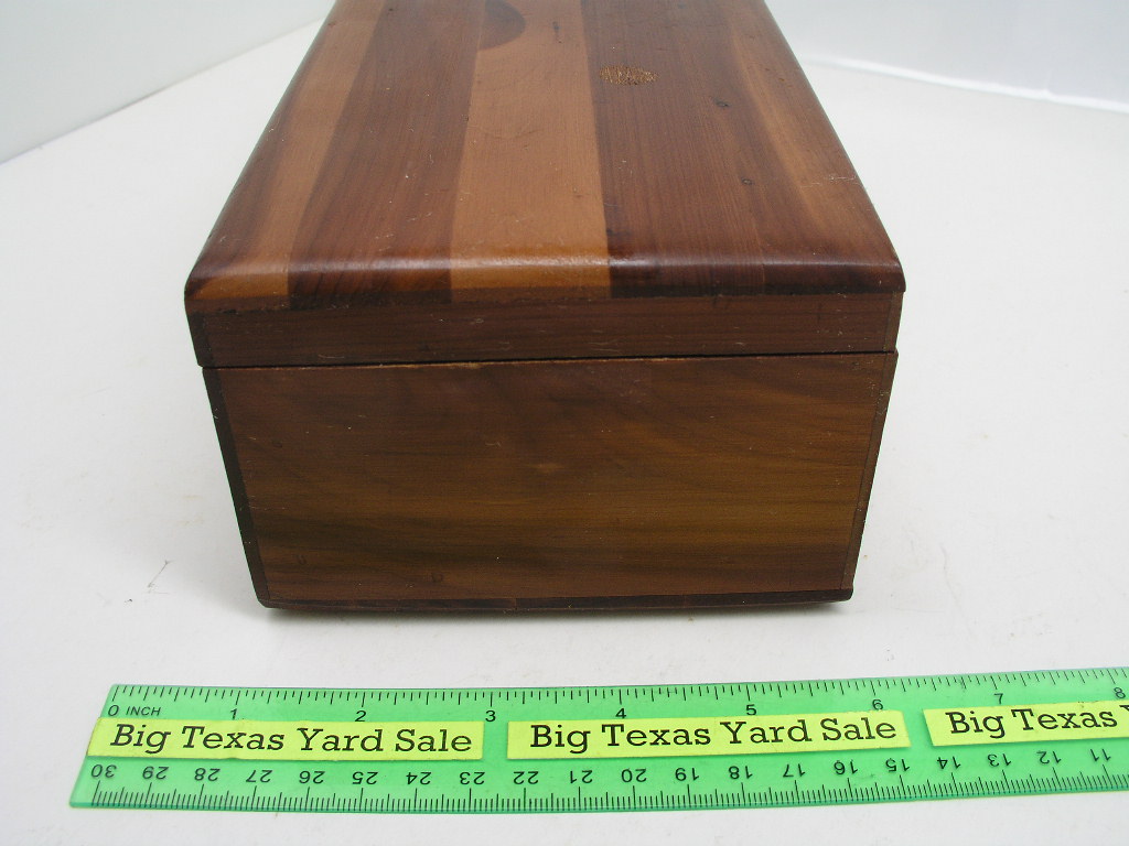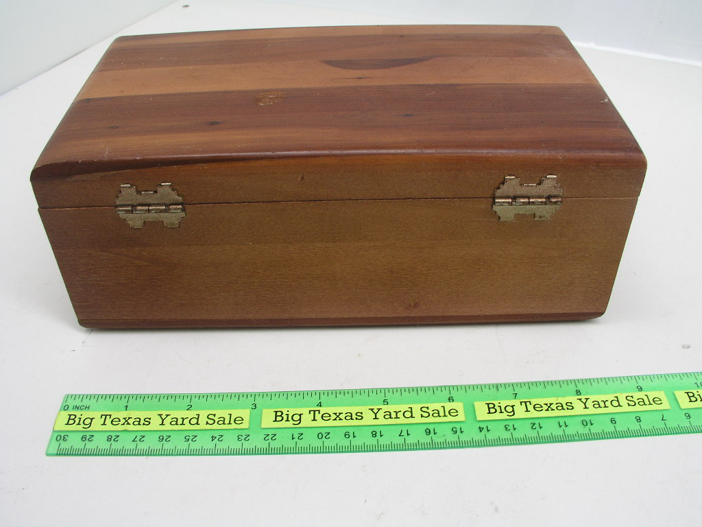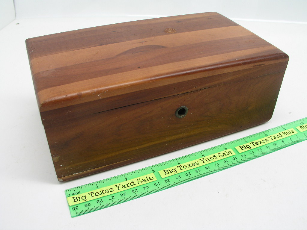 Cedar Keepsake Box measures 9 x 4-7/8 x 3-3/8″ high. Has slight cosmetic damage on one corner and no key for the lock. See photos for more detail.