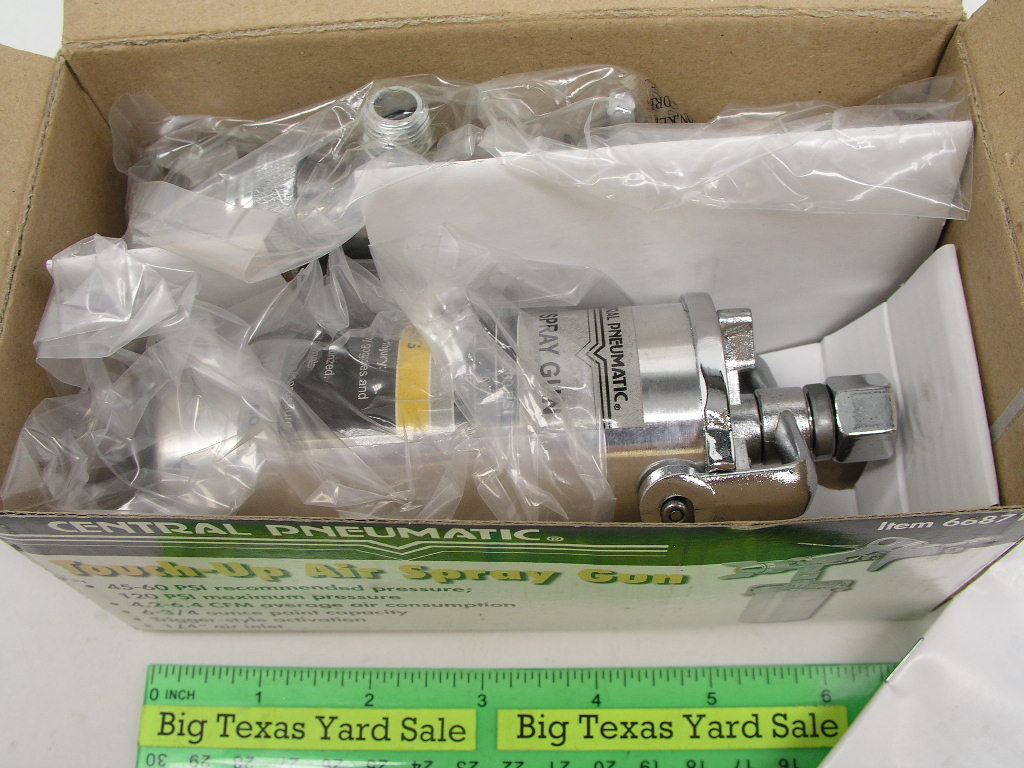 Central Pneumatic 66871 Touch Up Spray Gun has adjustment to alter the spray pattern from a circle to fan shape. New, packaging less than perfect cosmetically.