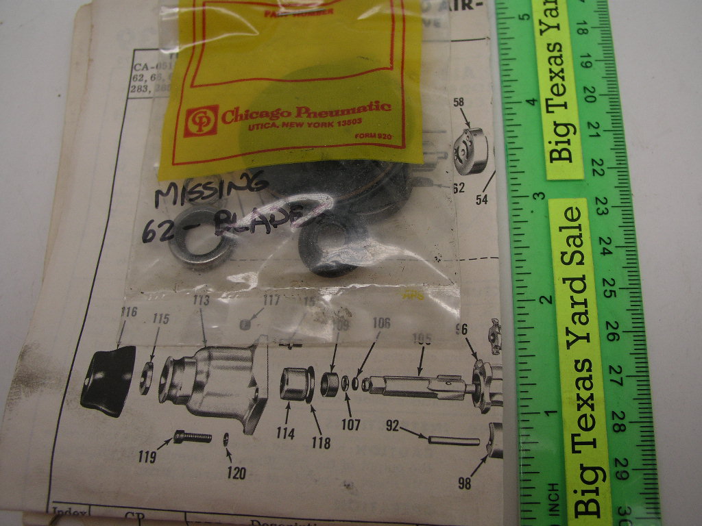 Chicago Pneumatic CP720 Impact Wrench Tune Up Kit CA51509 Lot A. Kit is new but packaging is in poor condition and kit is missing the rotor blades.