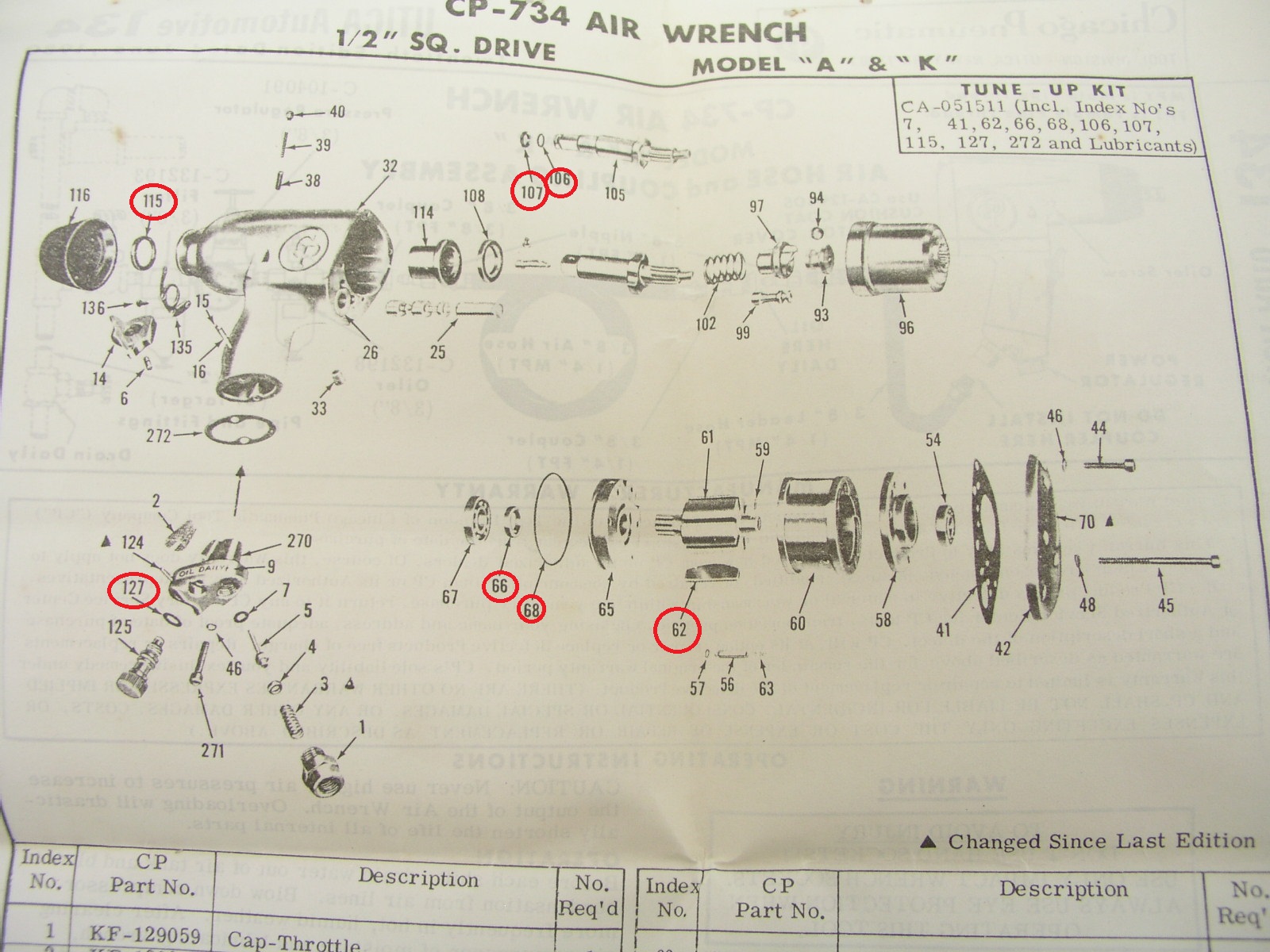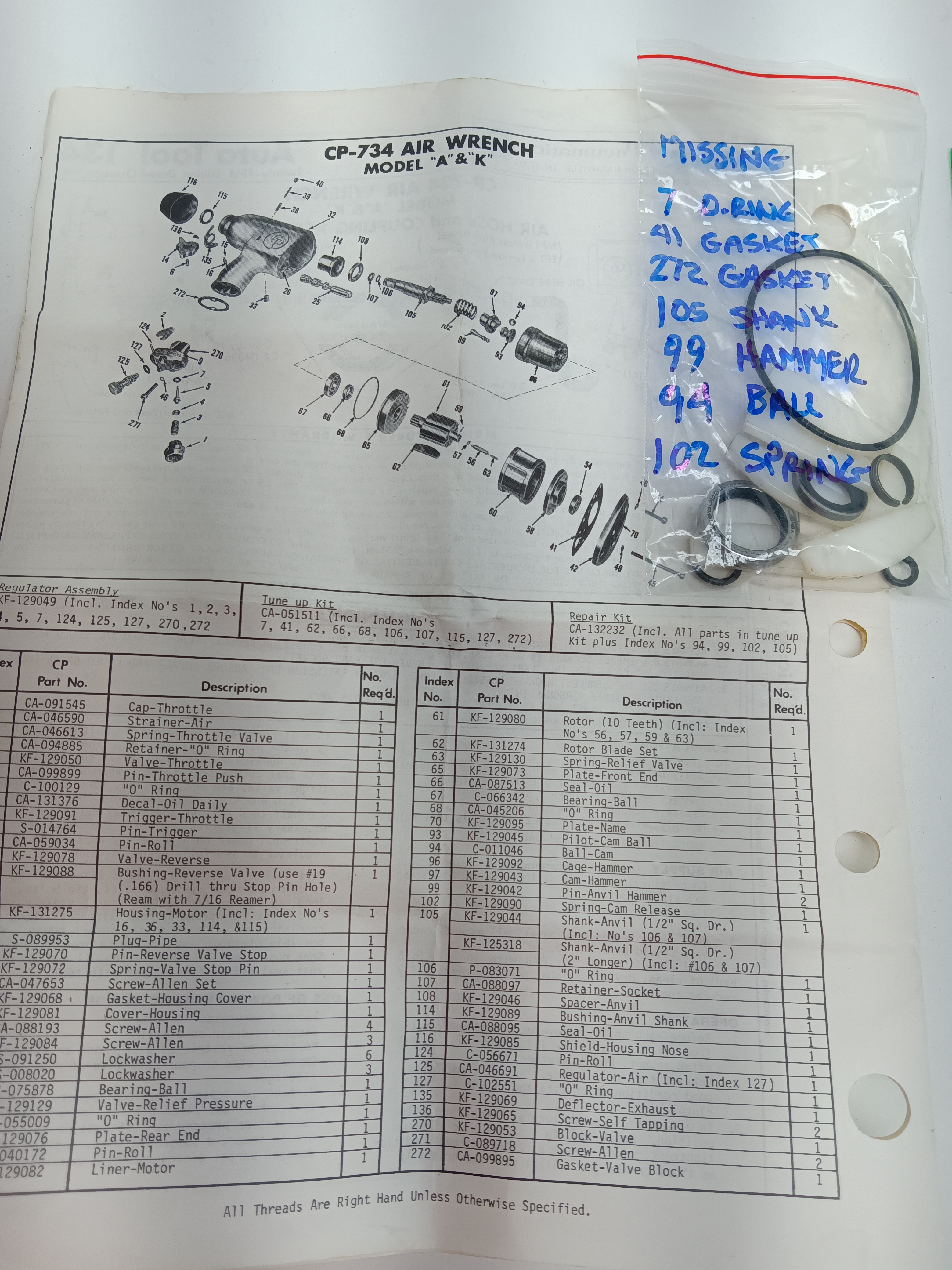 Chicago Pneumatic CP734 Impact Wrench Repair Kit CA-132232 Lot E. Kit is new but packaging is in poor condition, missing parts. Includes