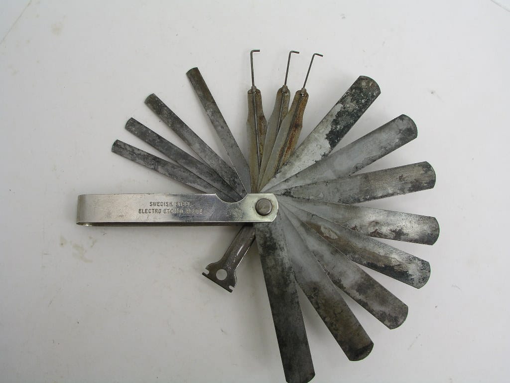 Vintage feeler gauge with dual inch and metric markings. See photo of lot C for condition. Gauge has stains on some parts, does not affect use.
