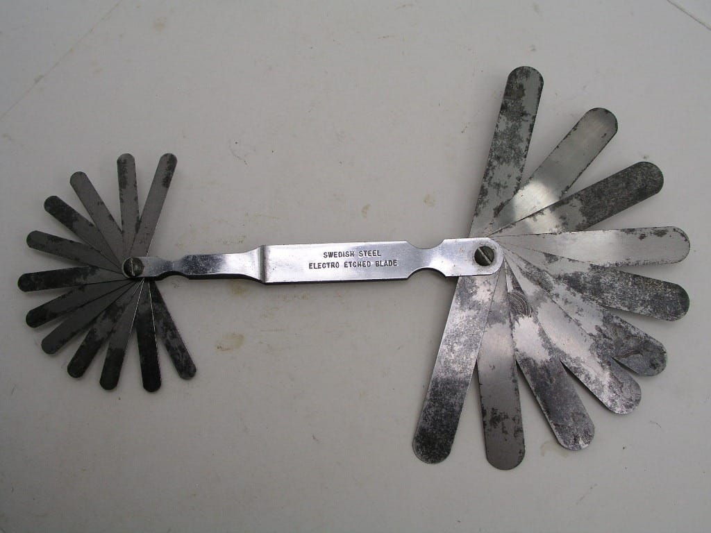 Vintage feeler gauge with 2 sizes of blades and dual inch and metric markings. See photo of lot D for condition. Gauge has stains on some parts, does not affect use.