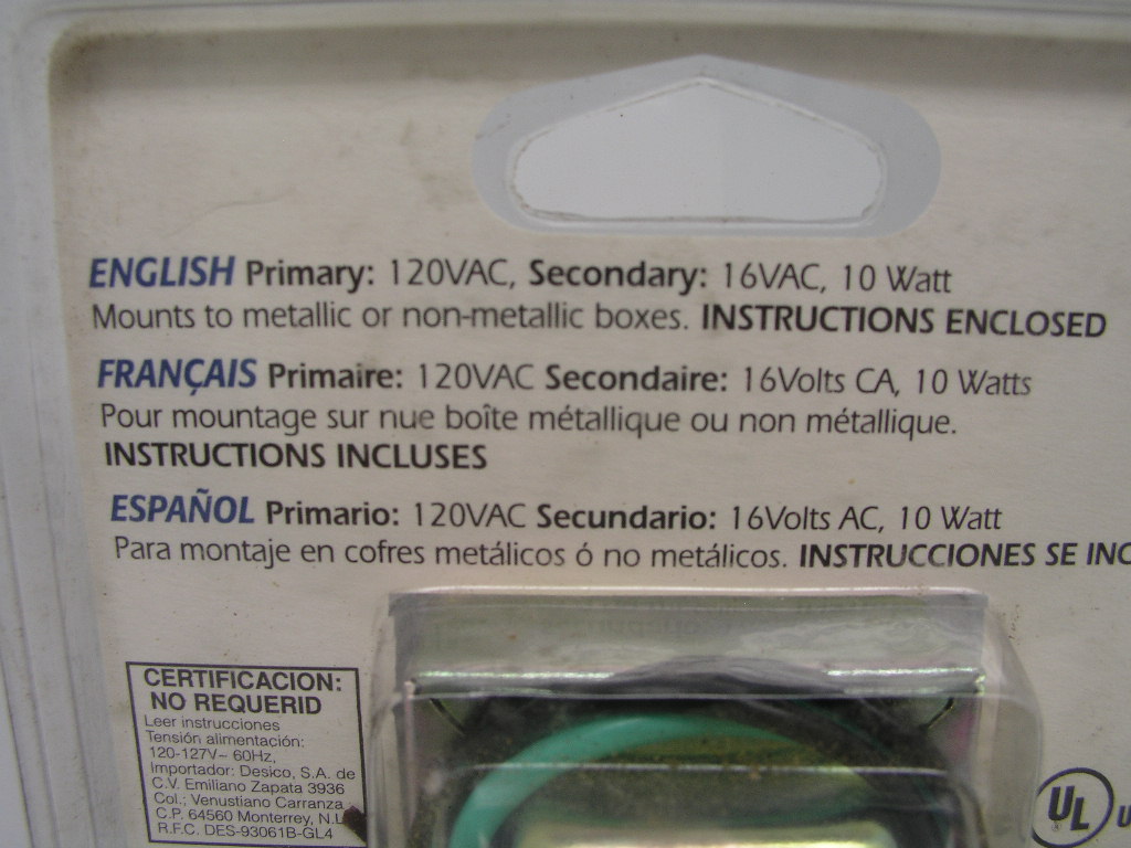 Heath/Zenith 120VAC Multi Purpose Transform with 16VAC Output is part 122C-A and rated for 10 watts.