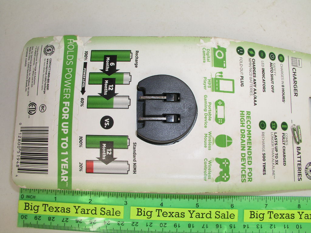 Battery charger can charge 4 batteries at a time and comes with 2 AA and 2 AAA rechargeble batteries. New, packaging is damaged.