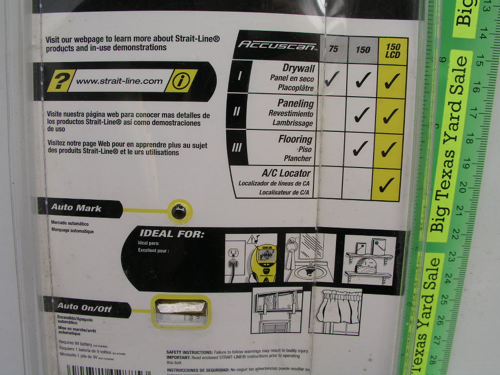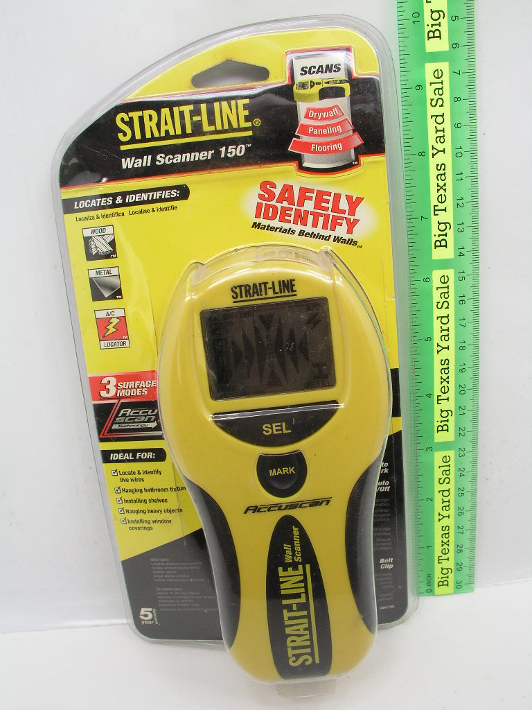 Strait-Line stud sensor locates wooden or metal studs as well as any live AC electrical wires.