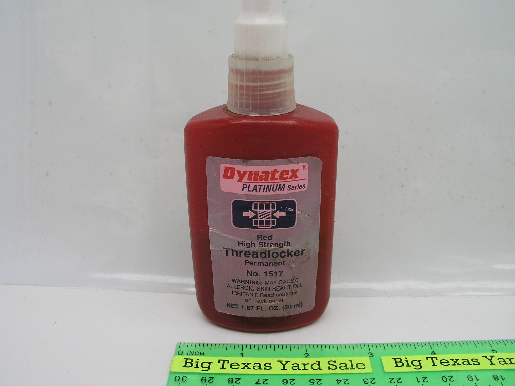 Thread Lock Red Hi Strength Dynatex 50ml bottle. Note: bottle is intentionally filled only half way because the product will harden without an air space.