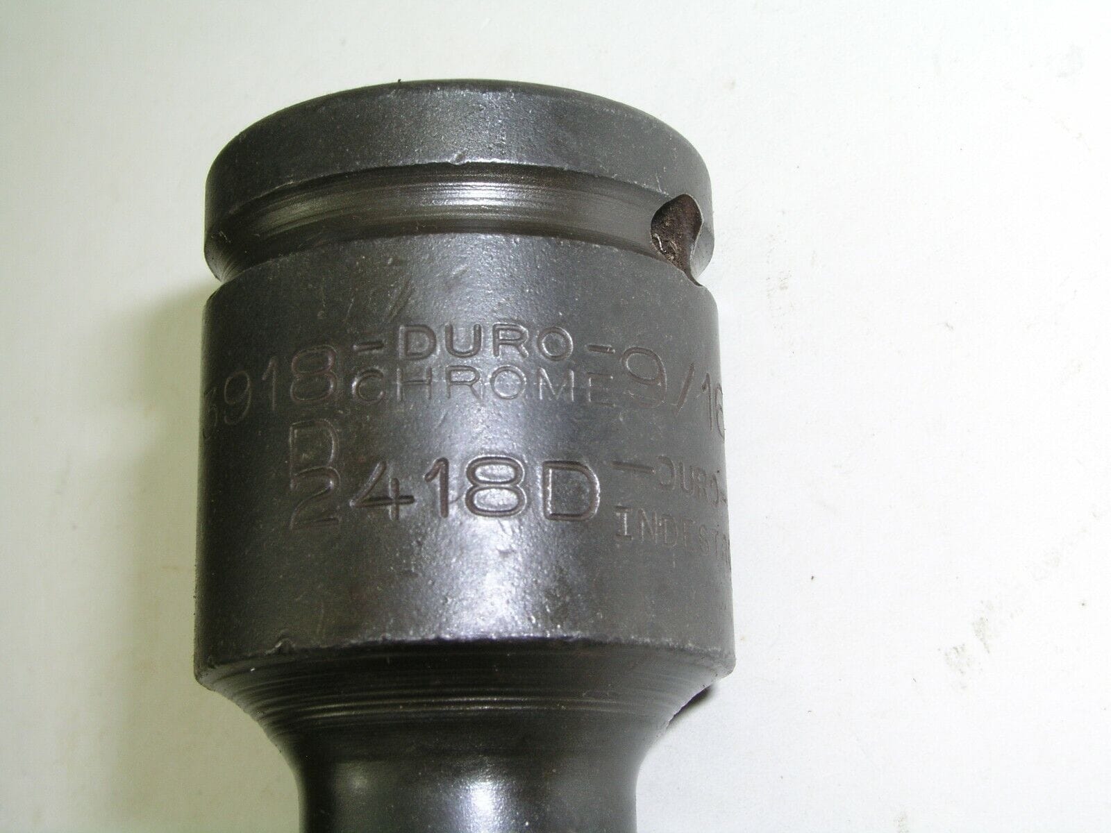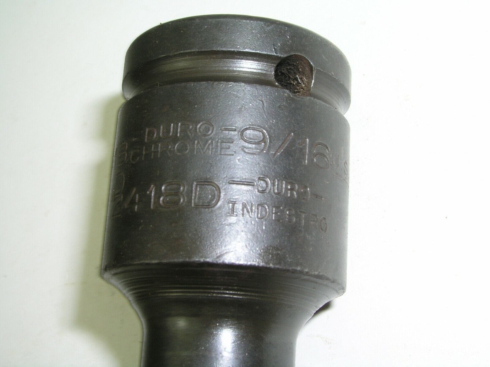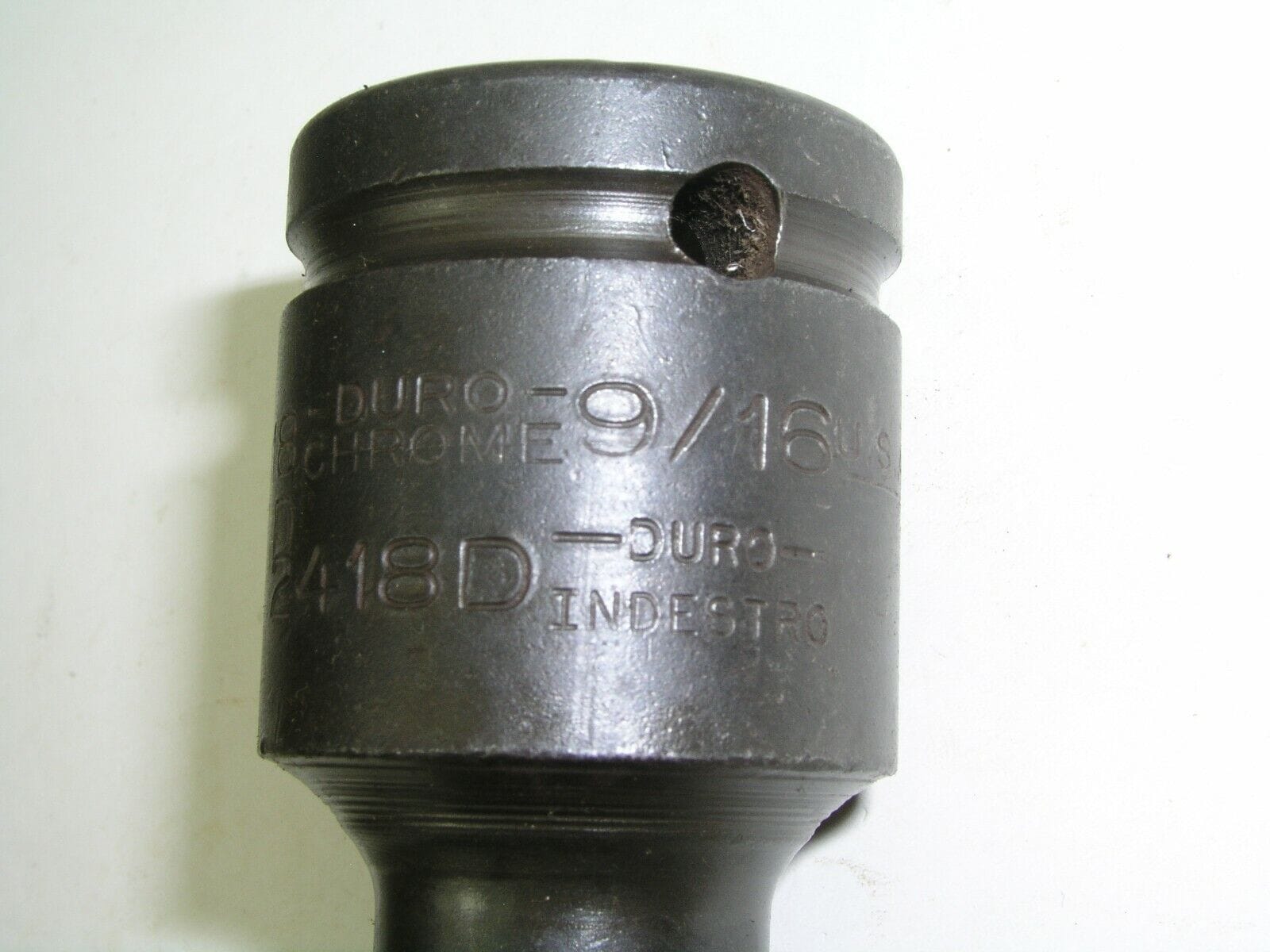 This 9/16″ 3/4″ drive socket has been struck twice. Duro and Indestro were two prominent brands in the mid 20th century that were manufactured in the same factory but had separate management structures. Apparently this socket got sent down both the Duro Chrome and Indestro stamping lines as you can see. It carries both brands and the part number for Duro 3918D and Indestro 2418D.