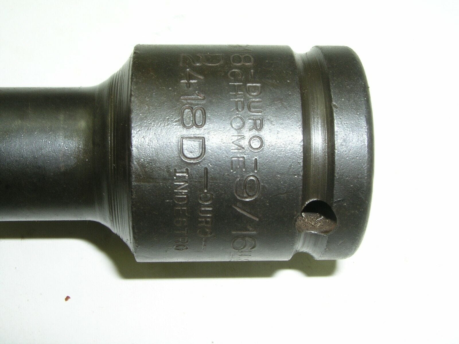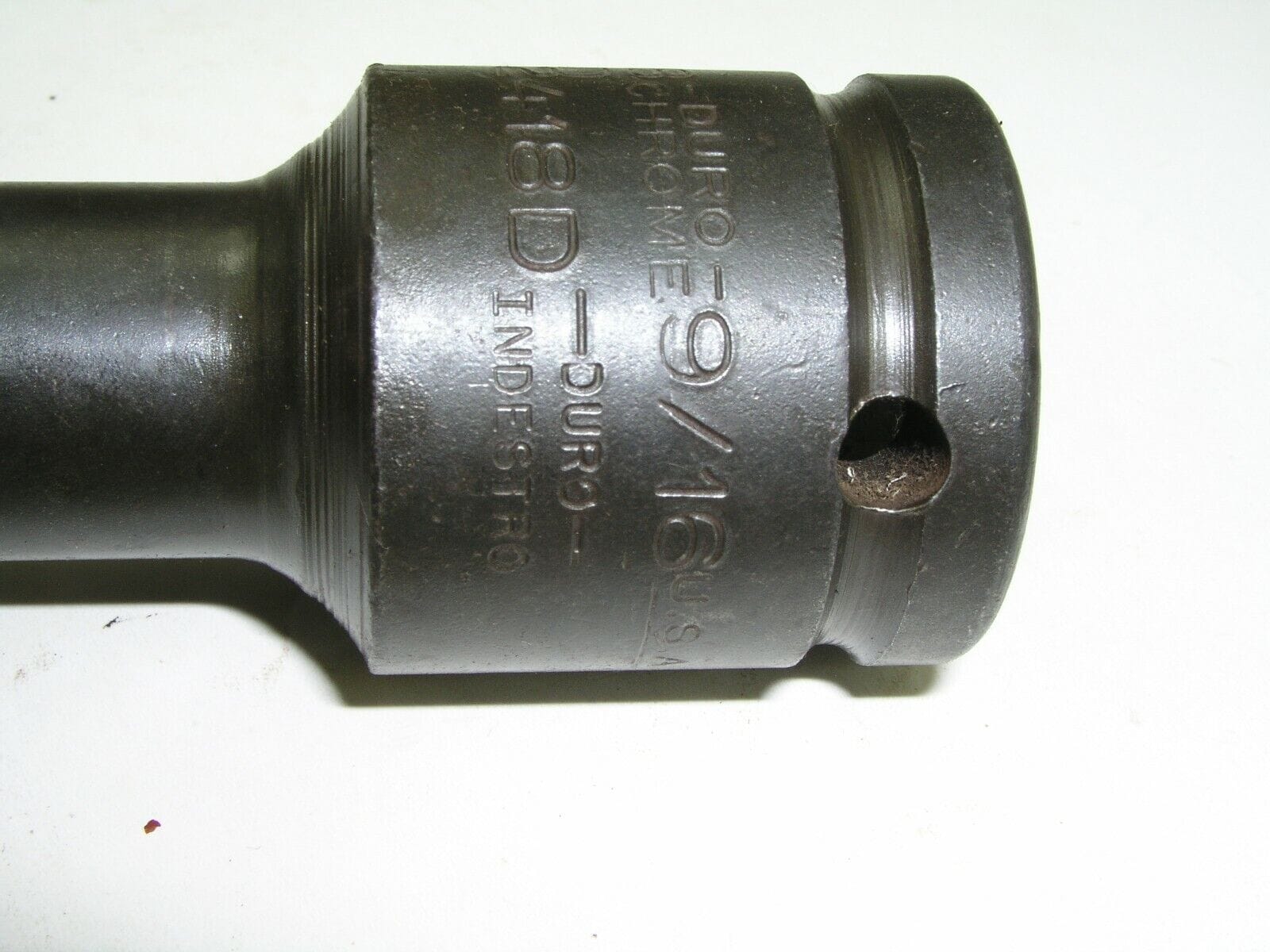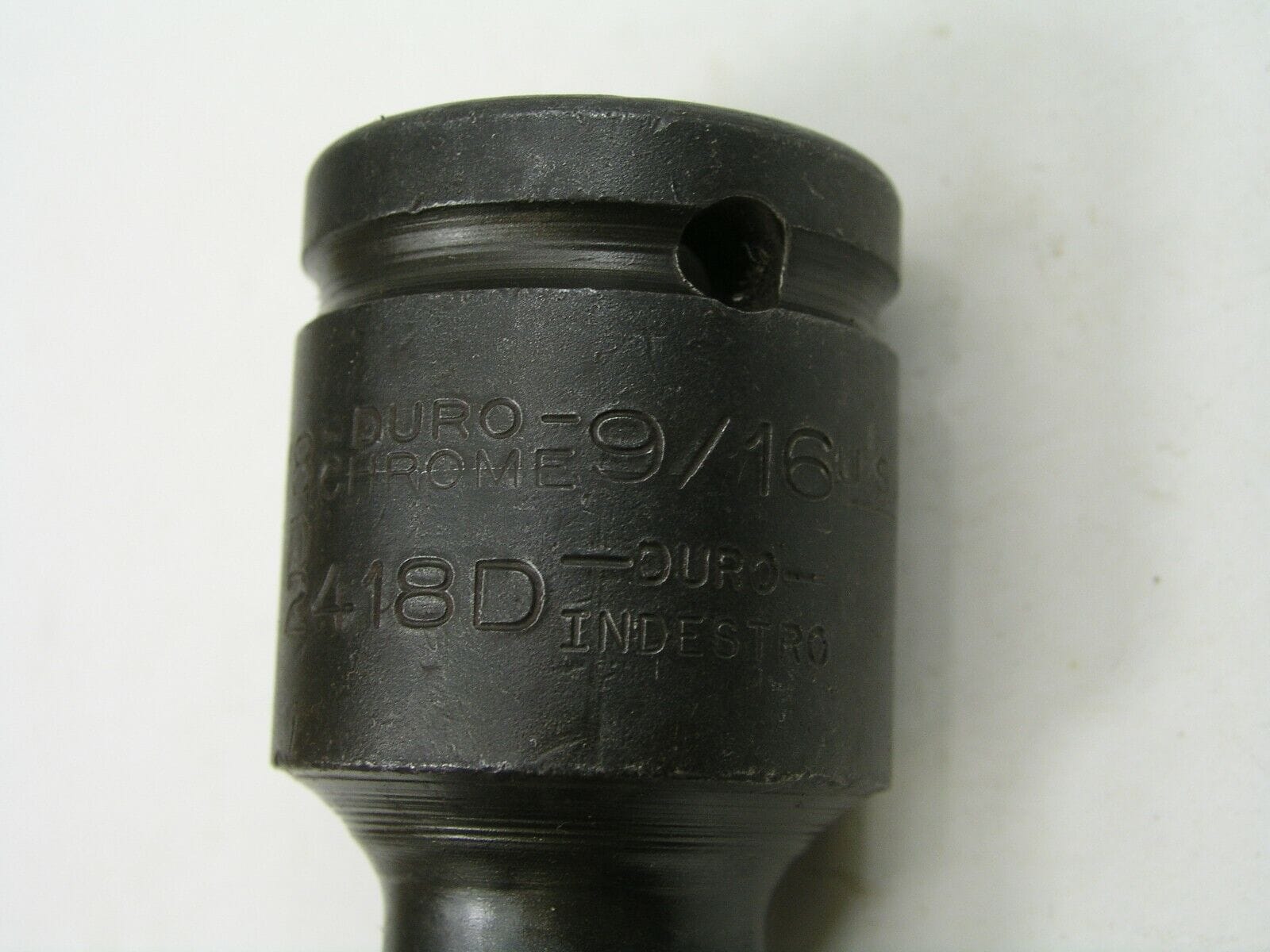 This 9/16″ 3/4″ drive socket has been struck twice. Duro and Indestro were two prominent brands in the mid 20th century that were manufactured in the same factory but had separate management structures. Apparently this socket got sent down both the Duro Chrome and Indestro stamping lines as you can see. It carries both brands and the part number for Duro 3918D and Indestro 2418D.