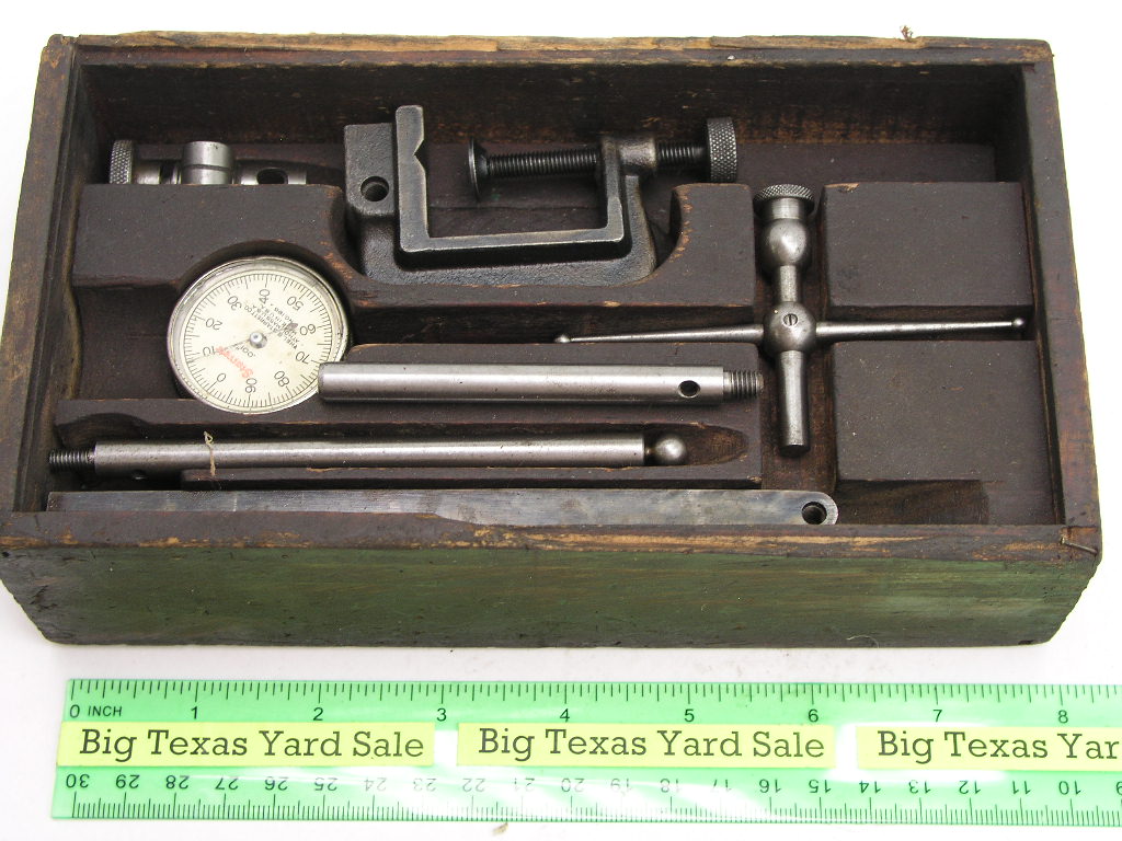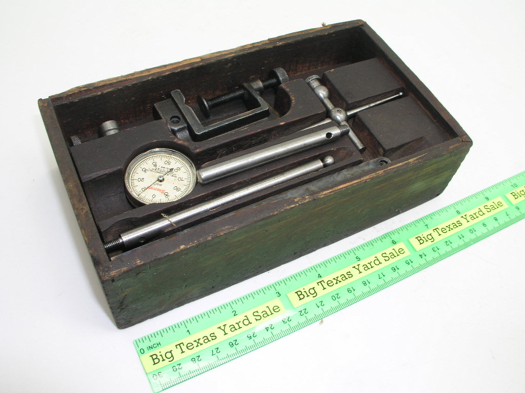 Vintage Starrett Dial Indicator Set with Wood Box. Note that there is no lid for the box and there is an extra rod included.